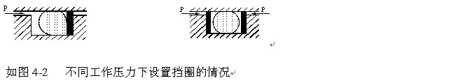为了使O形橡胶密封圈具有良好的密封作用和延长使用寿命,必须使O形橡胶密封圈的安装沟槽和密封部位的间隙设计恰当,当间隙过大时O形橡胶密封圈在油压的作用下挤间隙,造成损伤,从而引起漏损。当工作压力小于9.8Mpa时一般不设计挡圈,当压力大于9.8Mpa时O形橡胶密封圈承压面易被挤出,应加挡圈;若单向受压,在承压面设置一个挡圈,若是双向受压则要设置二个挡圈,如图4-2