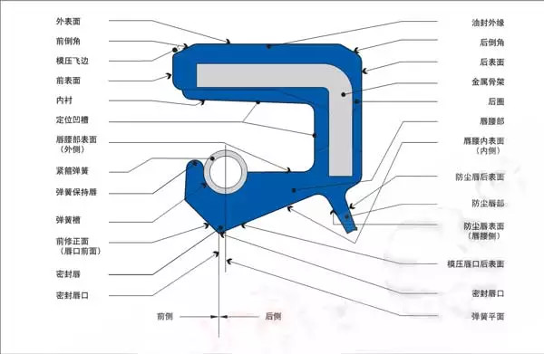 油封主要由密封体、加强骨架和自紧螺旋弹簧等几部分组成。密封体按照不同部位又分为底部、腰部、刃口和密封唇等。下图是:带弹簧并附有防尘唇的内包骨架油封各部位主要名称和术语。油封使用部位