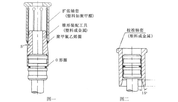 2.将聚四氟乙烯圈套入锥形装配工具,并用扩张轴套将它一直推入沟槽中,在这一过程中聚四氟乙烯圈被扩张。(见图一)