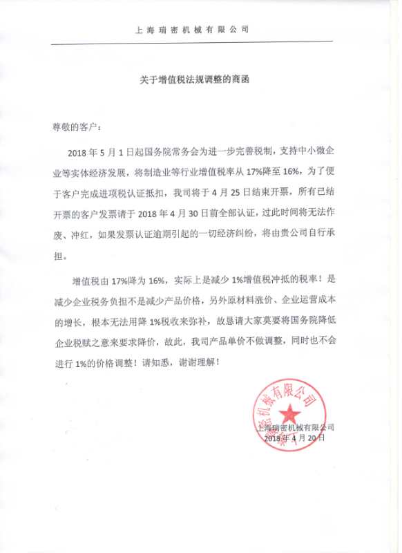 增值税由17%降为16%,实际上是减少1%增值税冲抵后的税率!让全国各企业都享受国家的减税政策!并不是将价格降低!也不是只对个别企业进行减税赋!更要注意,环保税今年已经开始征收,另人工及原材料涨价10%-30%,根本无法用降1%稅收能弥补,故恳请大家莫要将国务院降低企业税赋之好意去要求降价!否则国家对全国企业减少税赋就失去了公平意义!